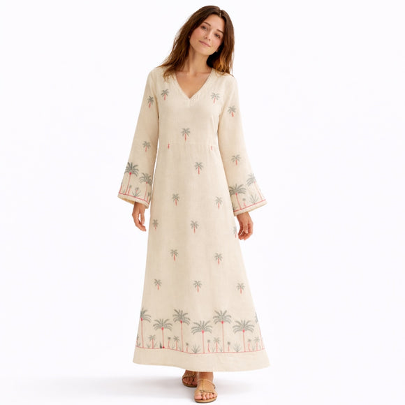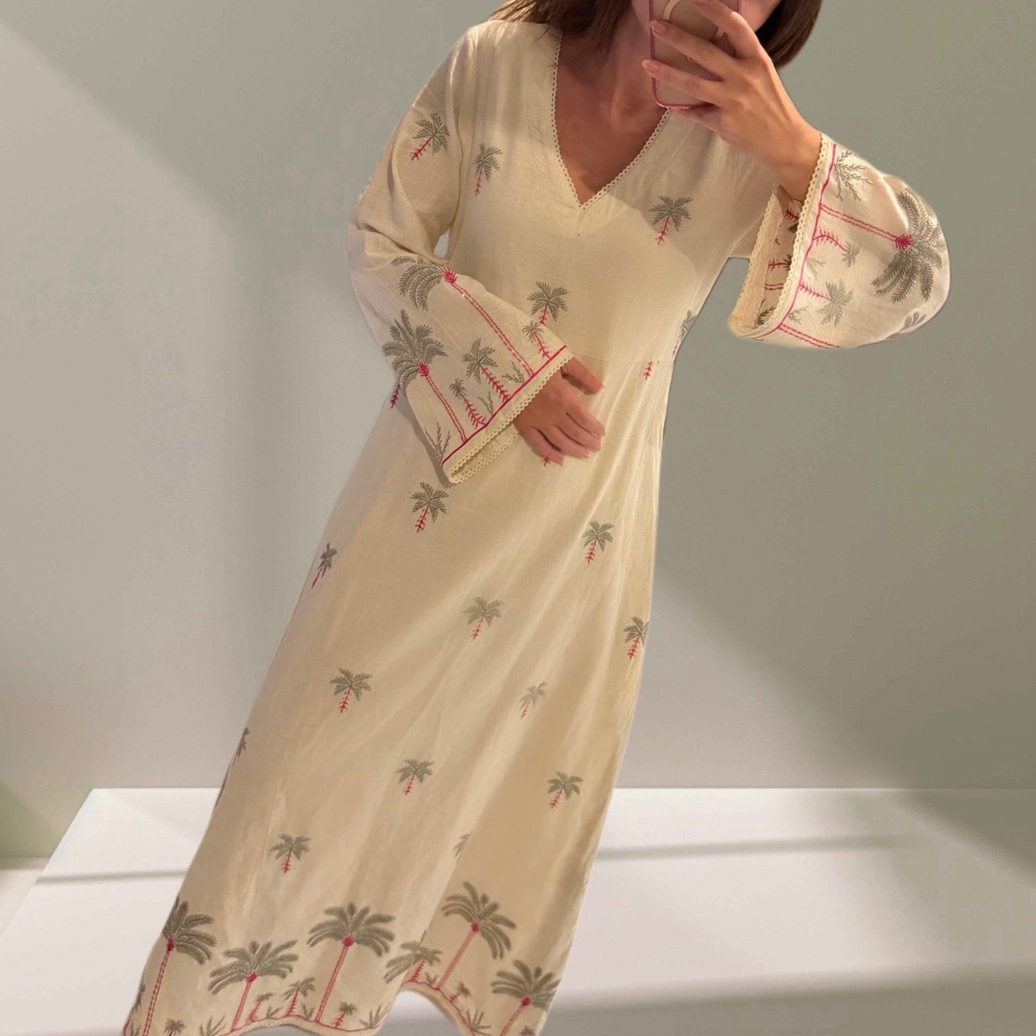 Crafted from soft linen and fully lined in breathable cotton, this kaftan is designed for comfort and ease. Delicately embroidered palm trees are scattered throughout, finished with subtle sequins that catch the light just enough ā never too much.