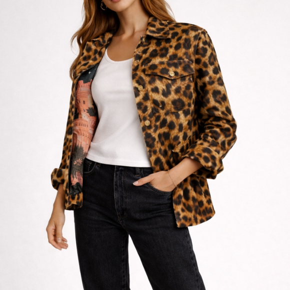 This army-style jacket is crafted from lightweight satin with a bold printed design for a modern, utilitarian look. It features a classic collar, button-front closure, and chest flap pockets, making it perfect for easy layering. Ā It comes in one size onlyĀ