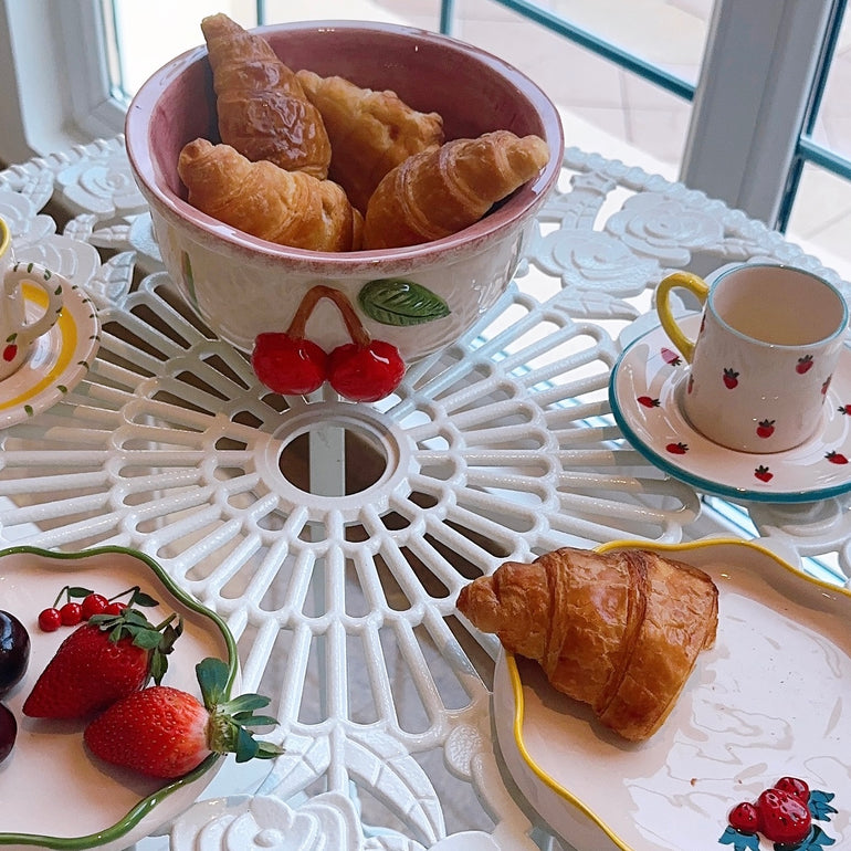 The Petite Collection, created by Feeling Good Inside, brings happiness to the table with its cheerful fruit patterns and hand-crafted details. This colorful and playful collection includes ceramic plates, mugs, and textiles.