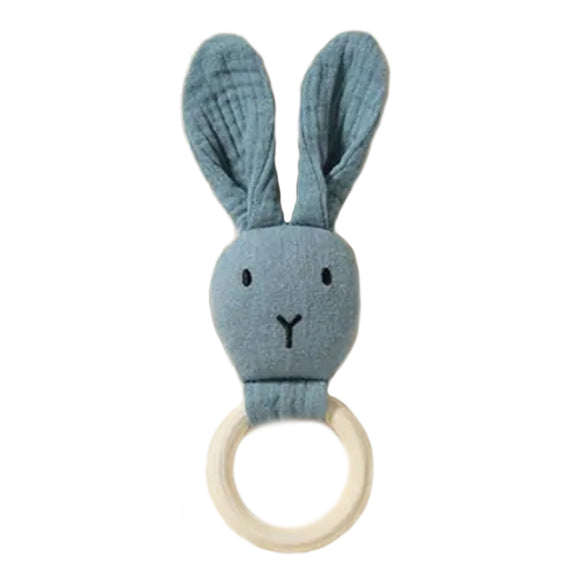 A cotton baby bunny that is attached to a natural wood teething ring.