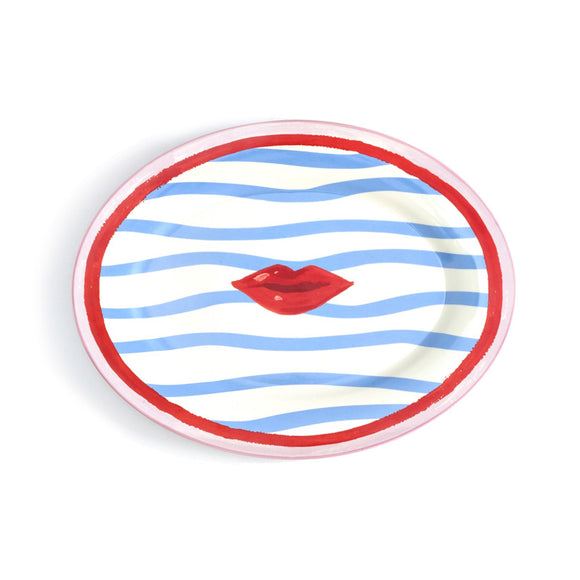 From lips to dips, the Eleanor Bowmer Electric Coast Stoneware Serve Platter is both beautiful and versatile, all rolled into one. Crafted from fine china, the serving platter features a fun and quirky blue wave design and is finished with a hand-illustrated lips icon. Pair with the coordinating Electric Coast range for a tablescape that is served with a kiss!