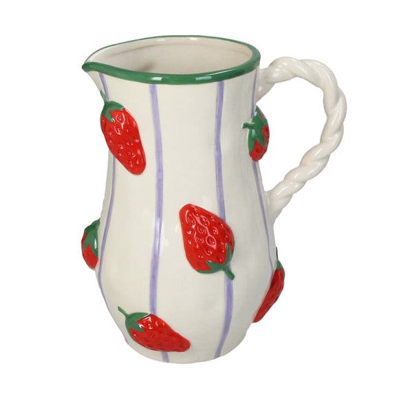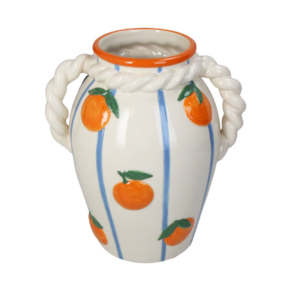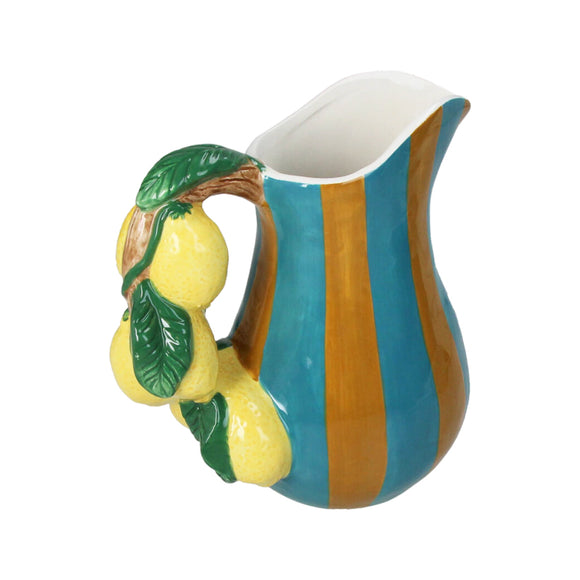 Bring a splash of Mediterranean charm to your table with this playful striped jug vase. Crafted from dolomite, it features bold teal and ochre stripes with a sculpted lemon and leaf handle for a cheerful twist. Use it as a statement pitcher, a vase for fresh blooms, or simply as a sunny decorative piece.