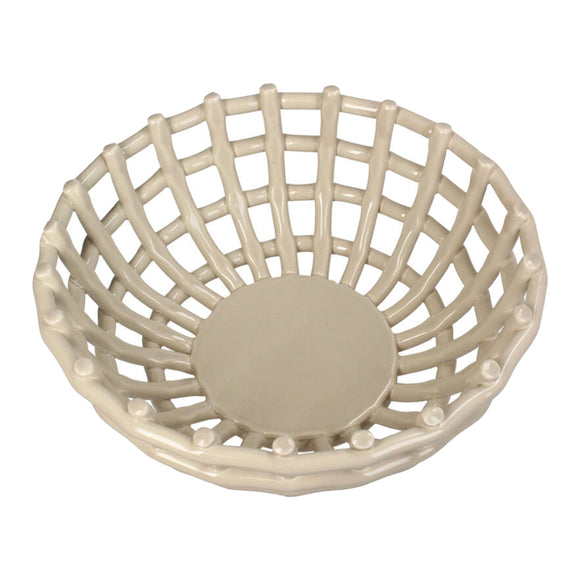 A stylish open-weave bowl crafted from smooth peachy dolomite. Perfect for holding fruits or decorative accents, it adds a modern, airy touch to any space.