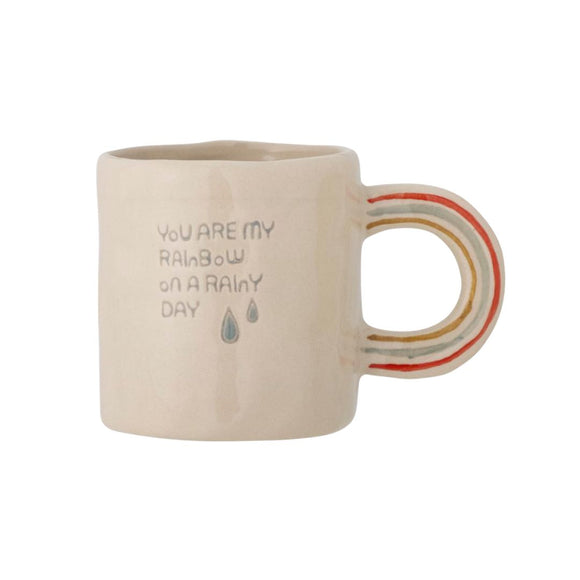 The Cloudy Mug is a fine and charming mug with the text "You are my rainbow on a rainy day" and a rainbow as a handle. The mug will undoubtedly spread joy and warmth in everyday life, and it is perfect for a cozy cup of tea or coffee. The mug comes in a beautiful plywood gift box with a cute print that matches the mug, making it a perfect gift idea.