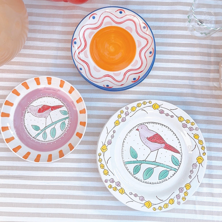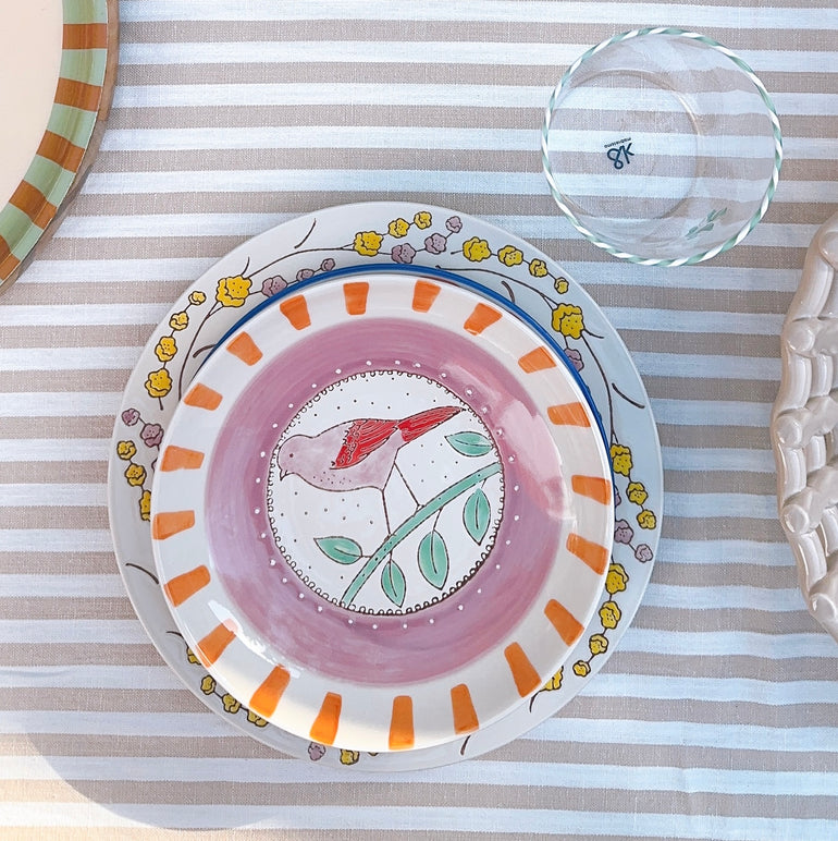 Charming stoneware plate featuring a hand-painted bird perched on a branch, framed by a floral border in soft yellow and pink tones. Perfect for adding a whimsical touch to your table setting. Matching soup or salad bowl set available.