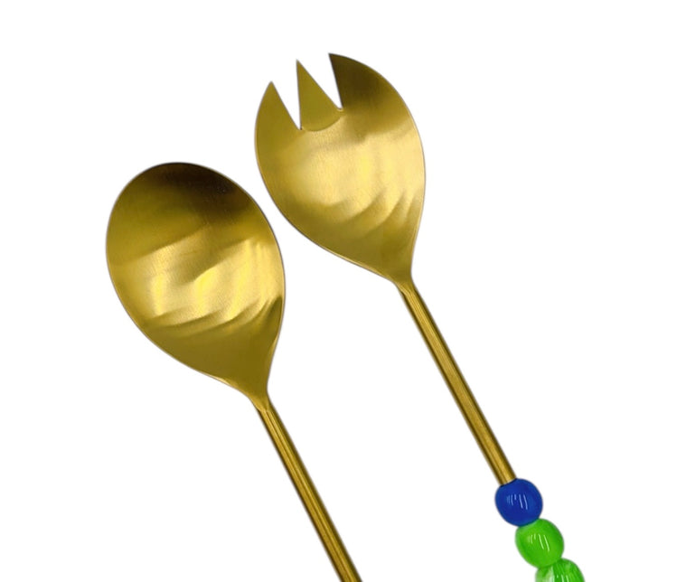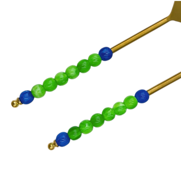 Elevate your dining experience with these hand-crafted Inna-designed salad spork servers. Crafted from brass with a luxurious gold-tone finish, each handle is adorned with hand-assembled resin beads in a stunning gradient of blue and green. The unique claw-like design of the serving ends adds a modern touch, making this set both functional and stylish.