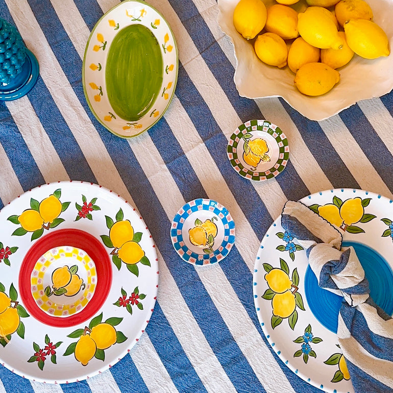 The Happy Citrons Collection is tastefully crafted by local masters and artists. These unique designs will add warmth to your kitchen and tables and boost your energy. You'll feel like you're on the romantic Amalfi coast of Southern Italy. They can be used as serving platters or other dinner plates.