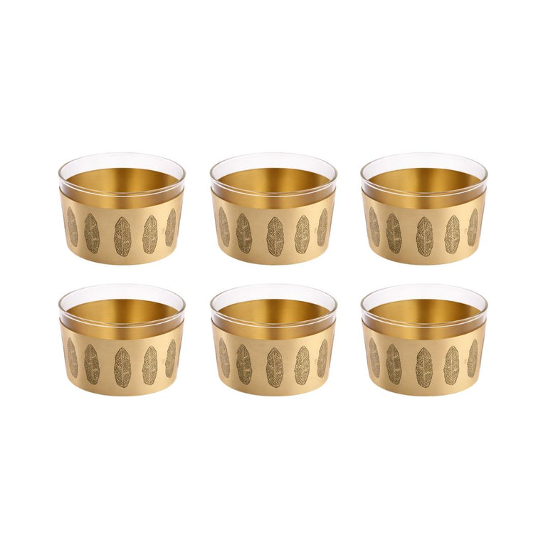 A refined brass serving bowl paired with a heat-resistant borosilicate glass insert, featuring elegant palm motifs. Designed for serving desserts with modern elegance. Set of 6.