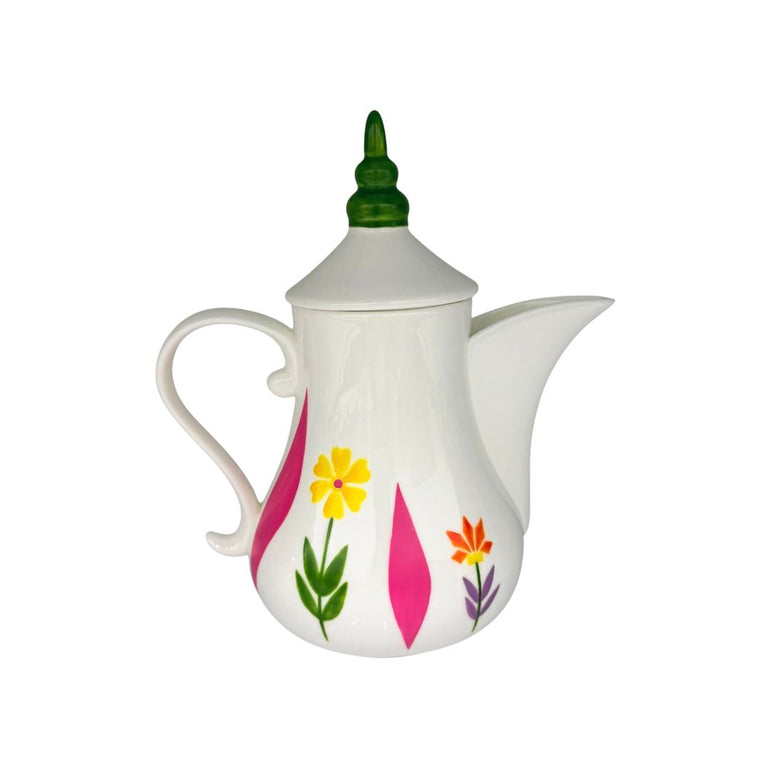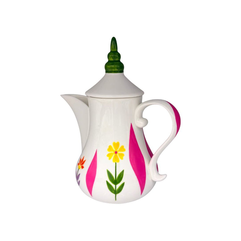 A beautifully hand-painted Dallah, crafted by skilled artisans and inspired by traditional Arabic coffee culture. Decorated with vibrant floral motifs and finished with a striking green finial, this piece blends heritage with a playful, contemporary touch.