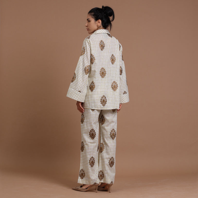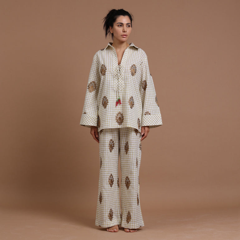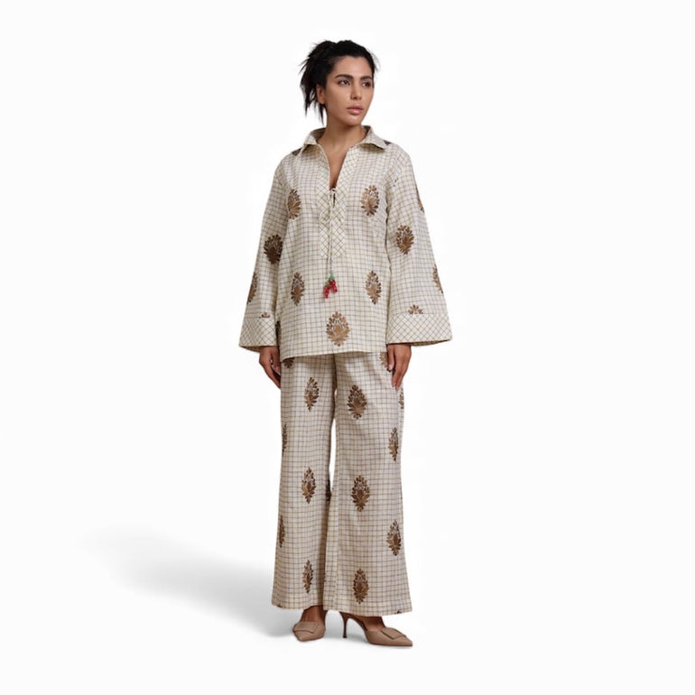 Relaxed and effortlessly chic, the Aliiah Set combines artisanal detail with everyday ease. Handmade with a breathable cotton-linen blend, it features an oversized embroidered top with a cut sleeves and a lace-up neckline adorned with playful beaded chili tassels. Paired with bell-shaped pants finished with a comfortable elasticated waist, this set moves easily from casual gatherings to sunny strolls while keeping your look elevated.