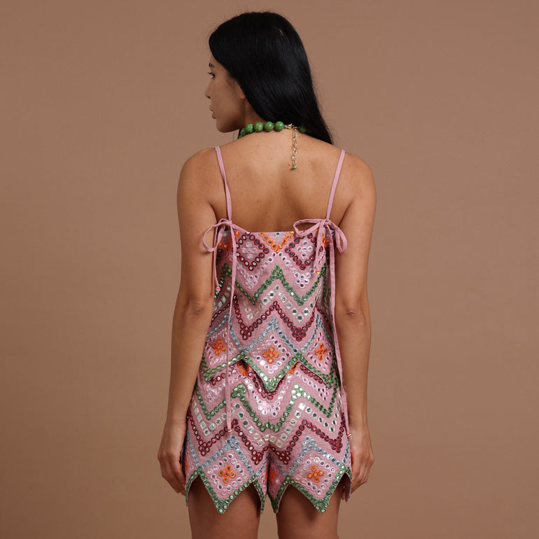 Vibrant and playful, the Mirate Set brings artisanal charm. Handmade in cotton, it features intricate mirror embroidery in a geometric pattern, paired with a flattering silhouette that catches the light beautifully. The airy camisole top with slim straps is balanced with relaxed shorts, both finished with a unique zigzag hemline that adds movement and style.