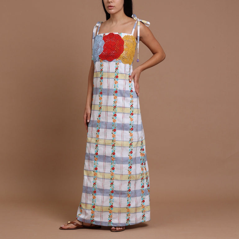 Effortless and feminine, the Sol Dress blends artisanal detail with timeless elegance. Handmade in soft cotton, it features delicate mirror hand embroidery for subtle shine and a flowy silhouette that flatters with ease. Fully lined for comfort and coverage, the design is finished with adjustable straps and a discreet side zipper for the perfect fit — your go-to for sunshine days and breezy evenings.